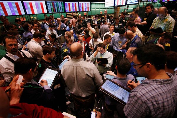 Traders gesture while working in the crude oil and natural gas options pit on the floor of the New York Mercantile Exchange March 7, 2011.Lucas Jackson/Reuters
