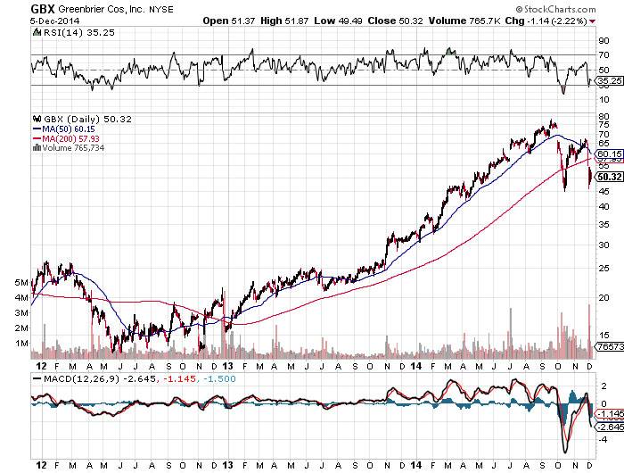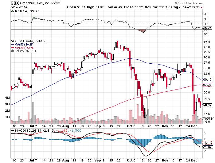 The six-month chart offers a close-up of the sell signals generated by the RSI and the MACD as we came into late September. The aggressive selling was followed by a bounce off of $47.50 by mid-October with a run to resistance at $67.50. From there the momentum indicators generated sell signals that saw the shares retest support at $47.50. At this time there are no patterns that indicate GBX is set to break higher.