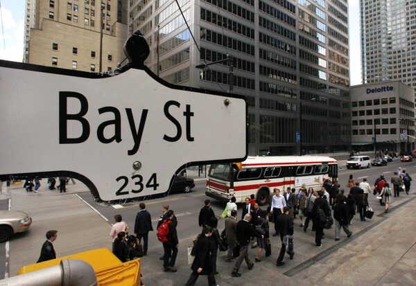 The Bay Street sign is pictured in the heart of the financial district as people walk by in Toronto.MARK BLINCH/The Globe and Mail