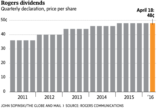 Rogers trades at about 16.9 times estimated 2016 earnings, compared with 16.5 for BCE Inc. and 14.8 for Telus Corp., according to Globeinvestor.com. Rogers' dividend yield of about 3.9 per cent is also lower than BCE's, at 4.7 per cent, and Telus's, at 4.5 per cent.