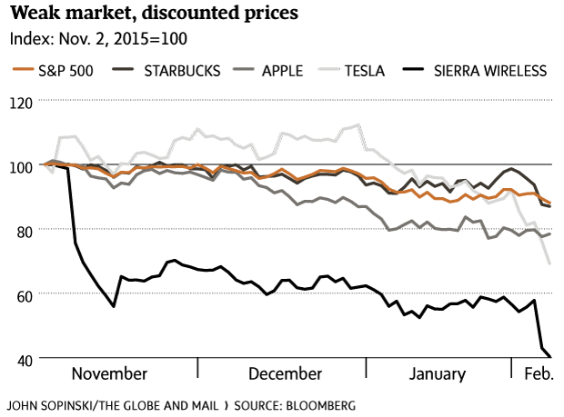 Over this same time period, Apple Inc. is down about 23 per cent despite record earnings. Tesla Motors Inc. is down about 30 per cent despite starting to ship its latest electric automobile, the Model X sport utility vehicle with unique "Falcon Wing" rear doors. Small-cap stocks tend to get punished even worse in downturns. Sierra Wireless Inc., a play on the "Internet of Things" that I last wrote about in November, is down about 35 per cent since that time and is off a whopping 56 per cent since its earlier highs that same month.