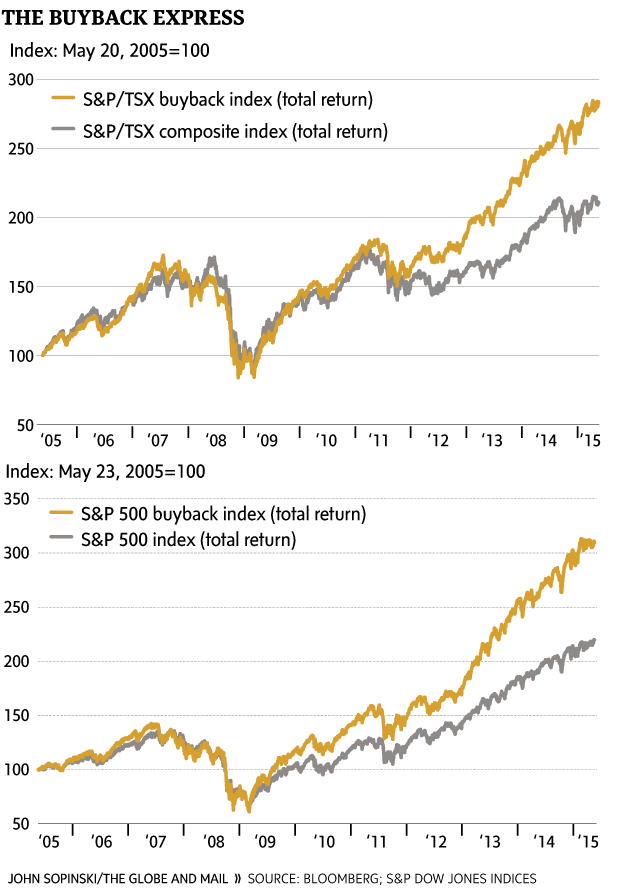 Whatever you make of those claims, the buyback strategy has left the market in its dust. In Canada, the S&P/TSX composite buyback index, which tracks the 50 stocks with the highest buyback ratios in the S&P/TSX composite index, has generated a total return of 10.98 per cent a year over the past decade, beating the market by more than three percentage points a year on average.
