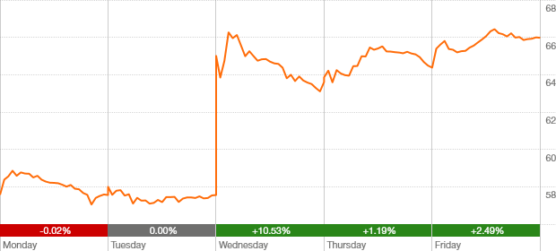 up $8.41 or 14.6% over week