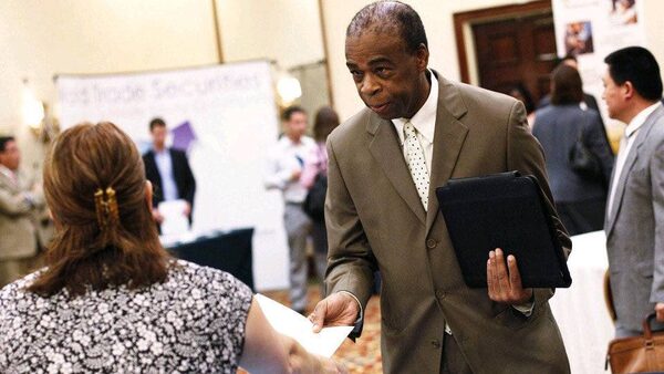 Faidy Jacques, 53, hands his resume to a job recruiter at a job fair in Melville, New York