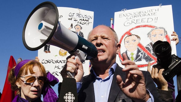 The Ontario Federation of Labour President Sid Ryan speaks to members of the Canadian Union for Public Employees (CUPE), representing flight attendants from Air Canada, as they protest labour disputes at the Toronto Pearson International Airport in Toronto, September 20, 2011.REUTERS/Mark Blinch