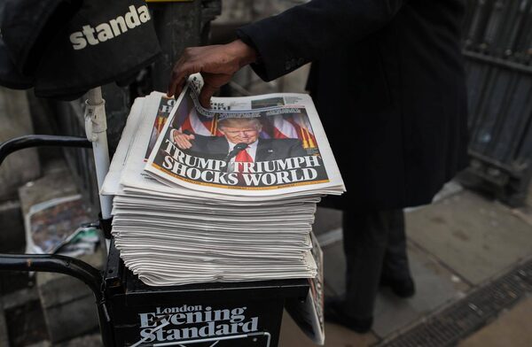 A passerby picks up a copy of the London Evening Standard newspaper, featuring a picture of U.S. President-elect Donald Trump on its front page, in the square mile financial district of London on Wednesday, Nov. 9.Chris Ratcliffe/Bloomberg