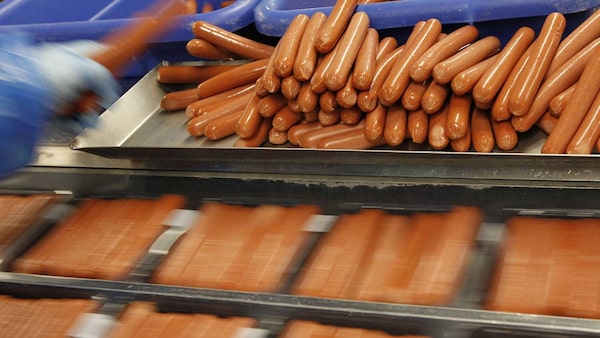 An employee makes sure the proper amount of wieners is in each package before it is sealed. Tour of the Maple Leaf Foods Hamilton wiener plant on February 17, 2011.Peter Power/The Globe and Mail