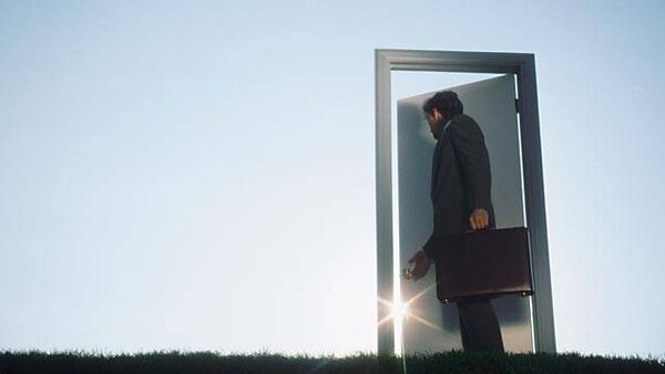 Businessman opening metaphorical door in field