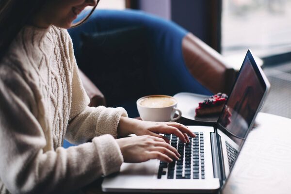 Smiling young woman using laptop at cafe