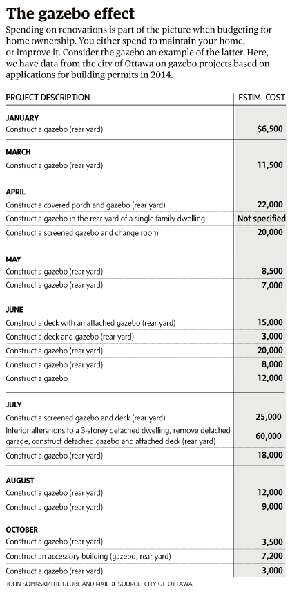 Last year, 20 or so homeowners applied to the city of Ottawa for a permit to build a gazebo on their property. The cost of these projects cost ranged, for the most part, between $3,000 and $25,000. When considering whether you can afford to own a home, remember to leave room for gazebos and other renovations.
