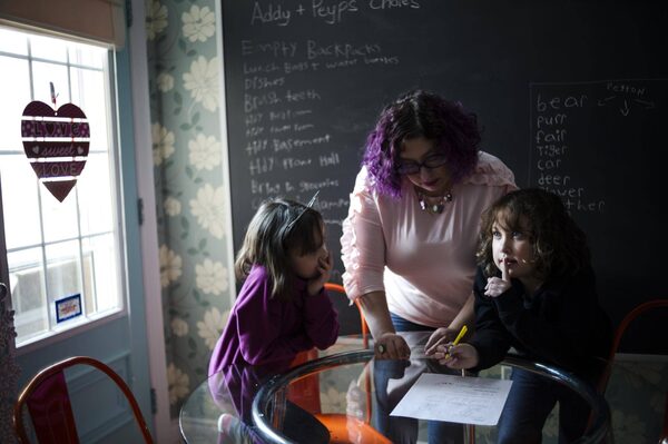 Lisa Van de Geyn, seen helping her daughters with homework at home in Vaughan, Ont., in February, says many parents she knows spend too much on their children because they feel they have to keep up with their friends.Christopher Katsarov
