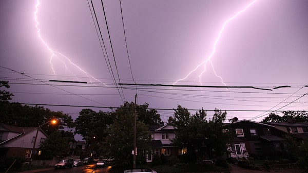 Lightning lights up the night sky in an east end neighbourhood on Wednesday during a severe thunderstorm warning and a tornado watch in Toronto.