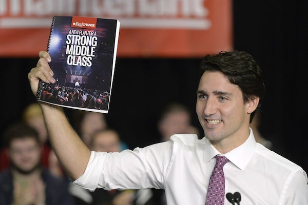 Liberal Leader Justin Trudeau holds up his party's platform at a press conference in Waterloo, Ont. on Monday, October 5, 2015.Paul Chiasson/The Canadian Press
