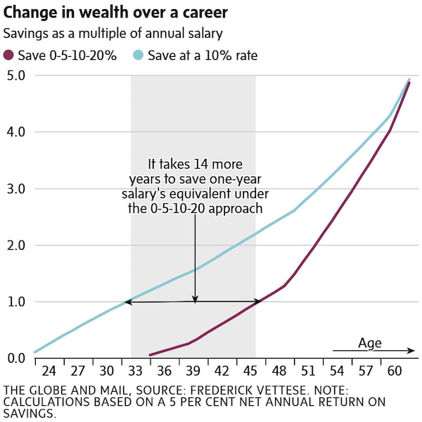 The chart shows two ways to get there. Jack could save 10 per cent of his pay every year for 40 years or he could wait until age 35 to start saving and then save 5 per cent from 35 to 39, 10 per cent in his 40s and then 20 per cent from 50 until retirement.