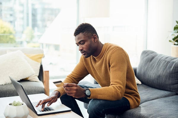Shot of a young man using a laptop and credit card at homeNicola Katie/iStockPhoto / Getty Images