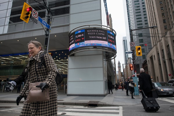 The stock ticker outside the Bank of Montreal building at King St. West and Bay St. in downtown Toronto illustrates the continued drop in the wake of COVID-19 developments.Fred Lum/the Globe and Mail