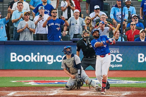 Blue Jays slugger Vladimir Guerrero Jr. hits a grand slam against the New York Yankees in Toronto in October, 2025. Flyers promoting Polymarket were recently handed out outside a Jays game despite a ban on the company in Ontario.Sammy Kogan/The Globe and Mail