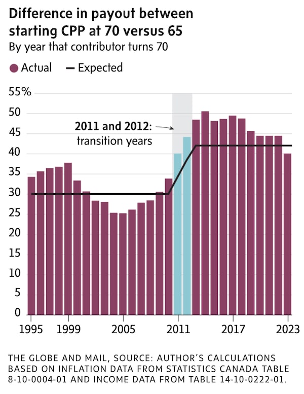 If you wait until 70 to start CPP pension, writes Frederick Vettese, former chief actuary of Morneau Shepell and author of Retirement Income for Life, the amount payable is adjusted upward. The adjustment factor – the “bump” – was just 30 per cent until 2010 but it has been 42 per cent since 2013 (2011 and 2012 were transition years). When you compare CPP pension starting at 70 with what you would be receiving if you started at 65, however, the bump has actually been more than 42 per cent between 2012 and 2022. (The reasons are technical and involve the difference between wage inflation and price inflation.) In 2023, the bump was less than 42 per cent, which is why he recommended that 69-year-olds in 2022 start their CPP that same year rather than waiting until 70. In another month or two, we will have a better idea of what to expect for 2024.The Globe and Mail