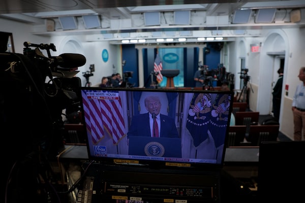 Journalists at the White House listen as U.S. President Donald Trump delivers an address to the nation about the Iran war, in Washington, D.C., U.S., April 1, 2026.Evan Vucci/Reuters