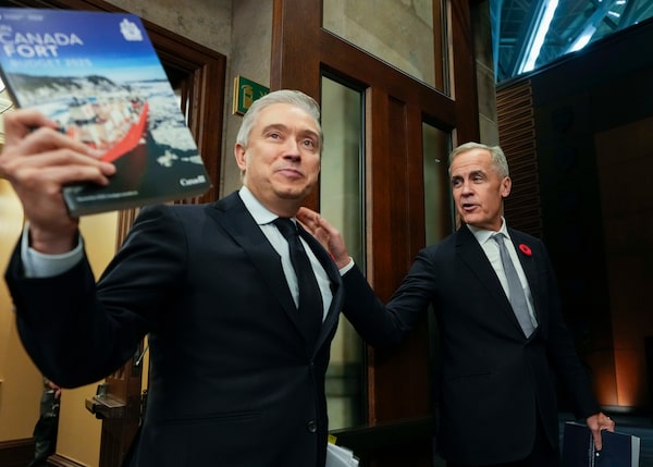 Minister of Finance and National Revenue Francois-Philippe Champagne and Prime Minister Mark Carney make their way into the House of Commons for the tabling of the federal budget on Nov. 4.Justin Tang/The Canadian Press