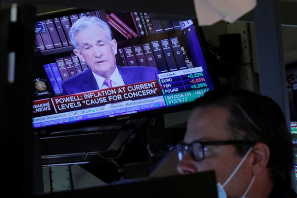 A screen shows U.S. Federal Reserve Chair Jerome Powell speak as a trader works inside a post on the floor of the New York Stock Exchange in New York City on Aug. 27. REUTERS/Brendan McDermidBRENDAN MCDERMID/Reuters