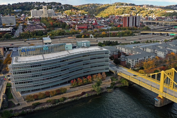 Apollo’s takeover of metals manufacturer Arconic, whose headquarters, left, sits on the Northside of Pittsburgh along the Allegheny River, is set to be financed by banks, including J.P. Morgan before the loan is sold to other investors.Gene J. Puskar/The Associated Press