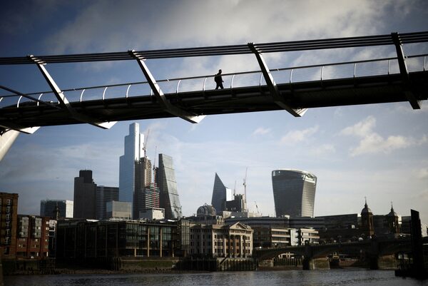 The City of London financial district is seen as a person walks over Millennium Bridge in London, Britain, Feb. 16.HENRY NICHOLLS/Reuters