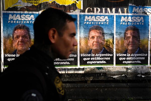 A man walks past a political poster of Argentina's Economy Minister and presidential candidate for Union por la Patria party, Sergio Massa, in Ezeiza, Buenos Aires province on Nov. 15.LUIS ROBAYO/AFP/Getty Images
