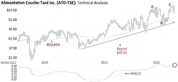 In our previous report (Sept. 19, 2021 - $49.85) we identified the start of a new uptrend and provided targets of $54 and $59. Earlier this year, Alimentation Couche-Tard ATD-T (Friday’s close $59.42) rose to a high of $59.60 to fulfill our targets (A).