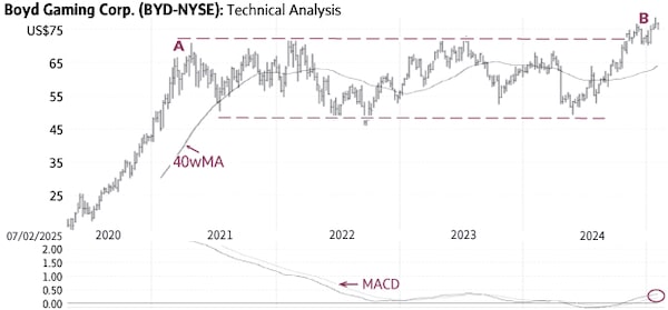 Boyd Gaming BYD-N had a sharp rise from $6.44 in 2020 (not shown) to $70.84 in 2021 (A) above the rising 40-week Moving Average (40wMA); it then settled in a wide horizontal trading range mostly between $49 and $72 (dashed lines). The recent advance to $78.58 above the top of this range signalled a breakout and the start of a new uptrend (B).