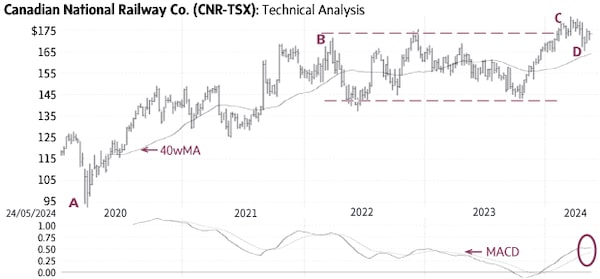 Canadian National Railway CNR-T rallied from $92.01 in 2020 to $171.48 in 2022 (A-B) and then settled in a trading range mostly between $140 and $172 (dashed lines). Earlier this year, the stock rallied above the top of this range (C), had a minor correction to the rising 40-week Moving Average (40wMA) where it found good support (D), and now appears ready to resume the uptrend. A sustained rise above $177-180 would confirm it.