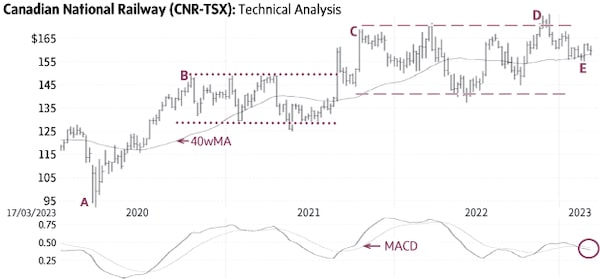 Canadian National Railway rallied from $92.01 to $149.11 in 2020 (A-B), stayed in a horizontal trading range mostly between $130 and $150 (dotted lines) and, after a rise to $168.66 in 2021 (C), settled in another range mostly between $140 and $170 (dashed lines).