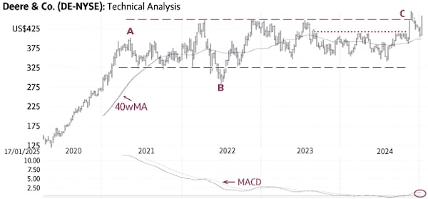 Deere (DE-N) surged from US$106.14 in 2020 (not shown) to US$400.34 in 2021 (A) and then settled in a multi-year trading range mostly between US$325 and US$450 (dashed lines). The stock dipped briefly below this range in 2022 (B) but quickly resumed trading within the horizontal range.