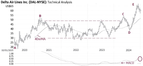 Delta Airlines DAL-N rallied from $17.51 in 2020 to $52.28 in 2021 (A-B) above the rising 40-week Moving Average (40wMA) and then settled in a trading range mostly between $29 and $49 for about three years (dashed lines). The stock had a sharp rise above the top of the range earlier this year and became overbought (C). Delta Airlines pulled back this summer dipping briefly below the average (D) and then resumed the uptrend to a higher high confirming the breakout and the start of a new uptrend (E).