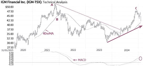 IGM Financial (IGM-T) rallied from $20.96 in 2020 (not shown) to $51.68 in 2021 (A) above the rising 40-week Moving Average (40wMA). In early 2022, the stock declined below the average (B) and started a downtrend below a falling trendline for about two years (dotted line). During the second quarter of 2024, IGM Financial rallied above the 40wMA and the falling trendline to signal a breakout and the start of a new up-leg (C).