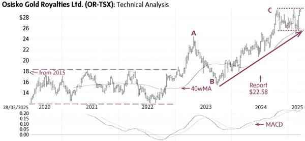 Osisko Gold Royalties OR-T built an eight-year base, mostly between $10 and $18 (dashed lines), had a breakout from that range in early-2023 (A) and then pulled back to $15.42 in October 2023 (B). In our previous report (June 13, 2024 - $22.58) we suggested that the stock appeared ready to resume the uptrend toward targets of $26 and $29. Subsequently, Osisko rallied to a high of $29.57 in October 2024 which fulfilled our targets (C). The stock is currently in the midst of a minor correction within a narrow range mostly between $25.50 and $29.50 (dotted lines). Only a sustained decline below $25.50 would be negative. A rise above $30 would signal the resumption of the long-term uptrend.
