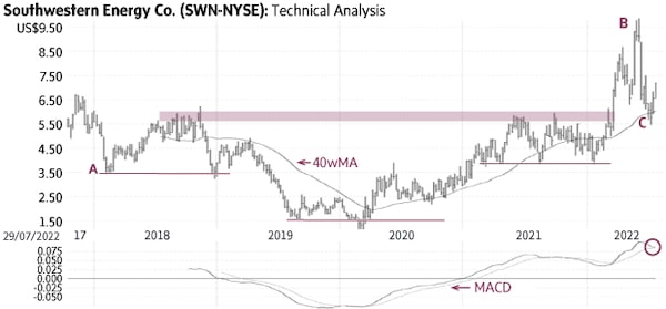 Southwestern Energy SWN-N (Friday’s close US$7.06) declined from US$15.59 in September, 2016, (not shown) to US$3.42 in February, 2018, (A) and then settled in a bullish, multiyear technical pattern known as an Inverse Head-and-Shoulders (solid lines). The recent rise above the neckline of this formation (shaded area) signalled a breakout and brought the stock to US$9.87 (B). At that point the stock became quite extended (far above its 40wMA) and it pulled back to find support toward its average, currently near US$6 (C). The former level of resistance at the neckline has become support. Only a sustained decline below his level would be negative.