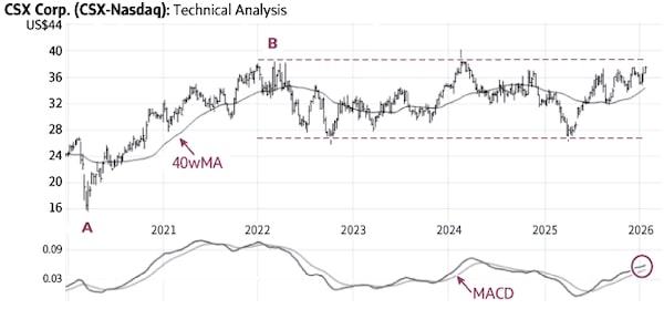 CSX Corp. (CSX-Q, Monday’s close US$37.47) rallied from US$15.60 in March, 2020, to US$38.63 in March, 2022, (A-B) while trading above its rising 40-week moving average (40wMA). It then settled into a broad trading range, mostly between US$27 and US$39 (dashed lines). A sustained move above US$39-40 would signal a breakout from this range and the start of a new uptrend toward higher targets.