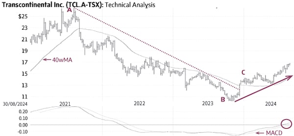 Transcontinental TCL-A-B declined from $26.45 in August 2021 to $10.11 in November 2023 (A-B) below a falling trendline (dotted line) and below the falling 40-week Moving Average (40wMA). The stock rallied above these indicators in late-2023 to signal the end of the downtrend (C). Transcontinental has since started having higher highs above a rising trendline (solid line) and above the rising 40wMA. A sustained rise above $17 would confirm the continuation of the uptrend.