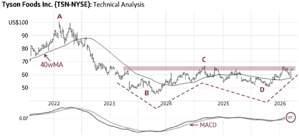 Tyson Foods (TSN-N, Monday’s close US$63.76) declined from US$100.72 in 2022 to US$44.94 in 2023 (A–B) while trading below its falling 40-week moving average (40wMA). It then rallied to US$66.88 in 2024 (C) before declining once more to a low of US$50.56 in 2025 (D), again below its falling average. Most recently, Tyson Foods rallied back above its average and is currently trading near the 2024 high. A sustained rise above US$66–67 (shaded area) would signal a breakout from a bullish technical base known as a “W” formation (dashed lines), supporting significantly higher targets.