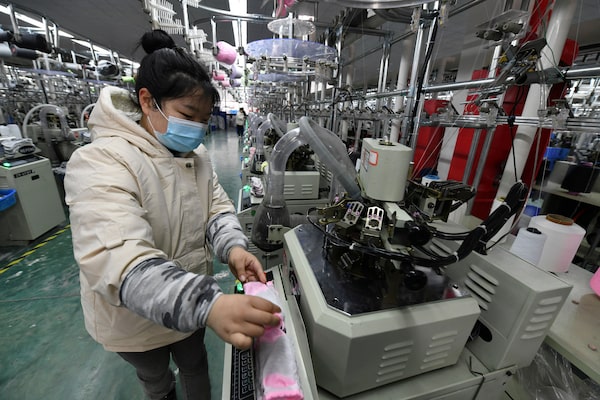 A worker operates a machine for knitting socks in a factory in Funan county in central China's Anhui province, on March 1.The Associated Press