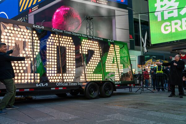 Revelers pose in front of a sign with the 2024 numerals after an illumination ceremony in Times Square on December 20, 2023 in New York City.David Dee Delgado/Getty Images
