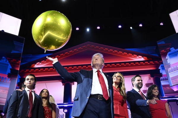 Donald Trump on stage during the last day of the Republican National Convention.BRENDAN SMIALOWSKI/Getty Images
