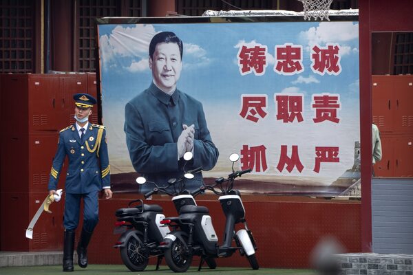 A Chinese honor guard member walks past a poster of Chinese leader Xi Jinping near the entrance to the Forbidden City in Beijing, Sept. 18.Mark Schiefelbein/The Associated Press