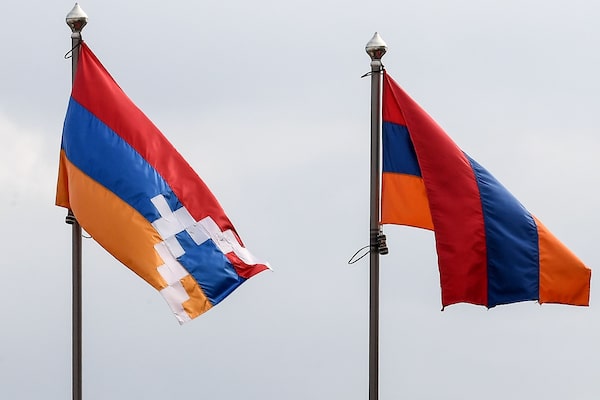 Flags of Armenia, right, and Nagorny Karabakh flutter in the breakaway Nagorny Karabakh's main city of Stepanakert on Oct. 2 during the ongoing fighting between Armenia and Azerbaijan over the disputed region.-/AFP/Getty Images