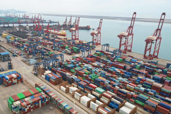 This aerial photo shows cargo containers stacked at a port in Lianyungang in China's eastern Jiangsu province on May 9.STR/AFP/Getty Images
