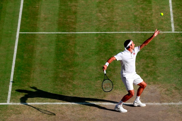 Switzerland's Roger Federer serves to Spain's Rafael Nadal during their men's singles semi-final match on Day 11 of the 2019 Wimbledon Championships at The All England Lawn Tennis Club in Wimbledon, southwest London, on July 12, 2019.ANDREW COULDRIDGE/AFP/Getty Images