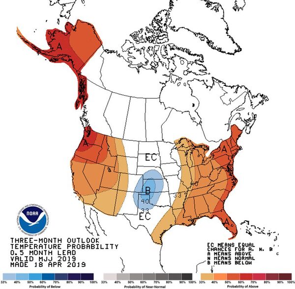 According to U.S. weather forecasters, weather is expected to change dramatically from cooler and wetter than average this spring to hotter and wetter than average from mid-May to the end of July this year. That means more natural gas will be needed to produce more than average power used for air conditioning. The stage is set for at least a short-term upside move in natural gas prices during their spring period of seasonal strength.