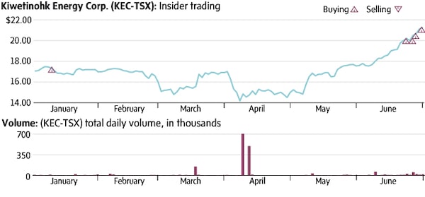 The share price of natural-gas tilted Kiwetinohk Energy Corp. KEC-T has been hitting new all-time highs after the company announced a business strategy review on June 23. The review focuses on potential opportunities including an exit from its power business. Since June 24, five insiders have spent $1.1-million buying shares in the public market. The 56,192 shares were purchased at an average price of $20.36. A recent purchase took place on July 2 when senior officer Janet Annesley bought 2,350 shares at $21.26.