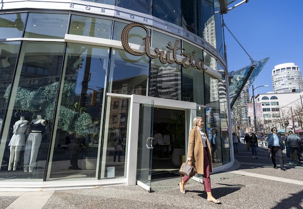 A shopper exits Aritzia on Robson Street in Vancouver on March 30.Kayla Isomura/the Globe and Mail